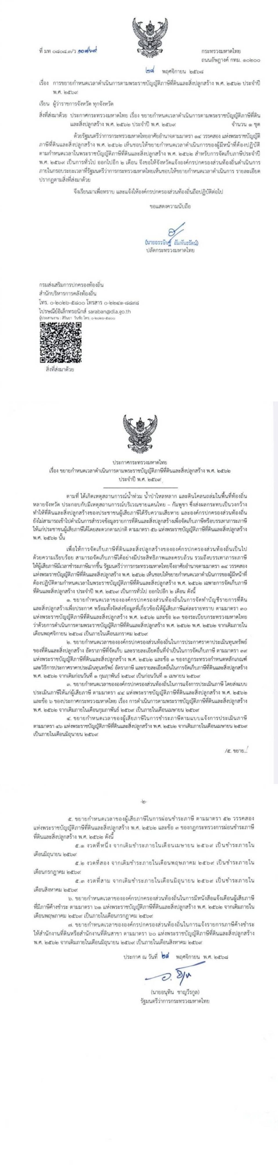 การขยายกำหนดการดำเนินการตามพระราชบัญญัติ ภาษีที่ดินและสิ่งปลูกสร้าง พ.ศ.2562 ประจำปีพ.ศ. 2569 |
