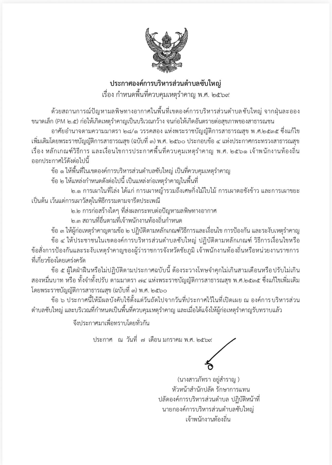 ประกาศองค์การบริหารส่วนตำบลซับใหญ่ เรื่องกำหนดพื้นที่ควบคุมเหตุรำคาญ พ.ศ. 2569
